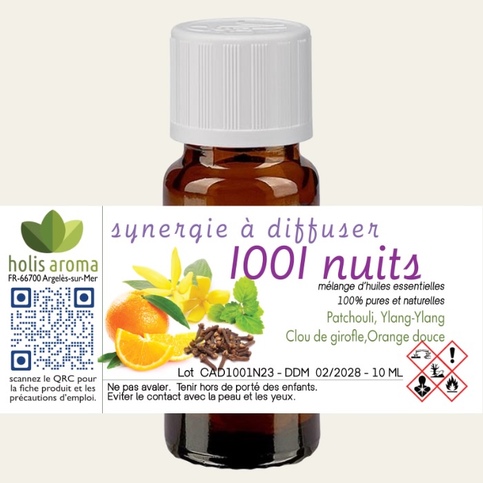 La composition à diffuser 1001 Nuits réunit Patchouli, Ylang-Ylang, Girofle et Orange douce. Ces huiles essentielles sont reconnues pour leurs propriétés relaxantes, aphrodisiaques et harmonisantes, parfaites pour instaurer une ambiance douce, enveloppante et chaleureuse.