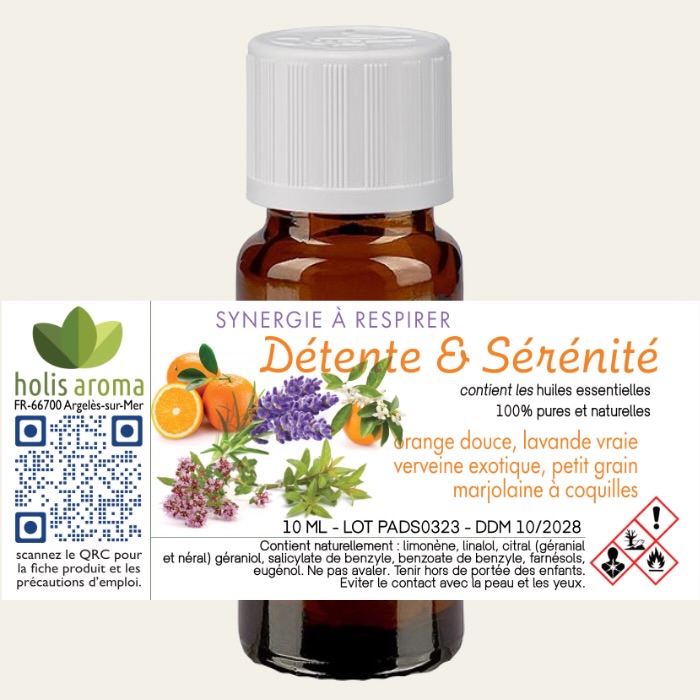 La synergie Détente & Sérénité réunit Orange douce, Ylang-Ylang, Litsée citronnée et Petit grain. Ces huiles essentielles sont reconnues pour leurs propriétés relaxantes, calmantes et harmonisantes, parfaites pour apaiser le stress, l’anxiété et les chocs émotionnels.