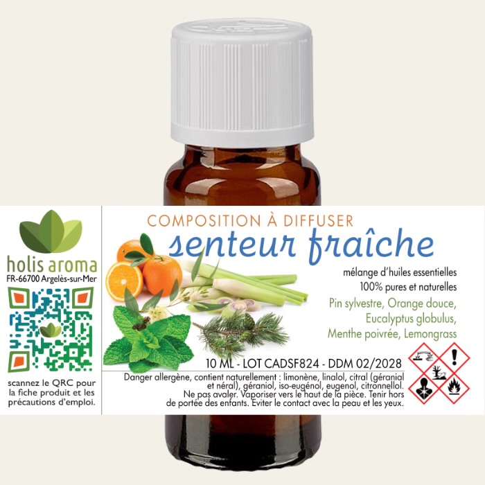 La composition à diffuser Senteur Fraîche réunit Eucalyptus globulus, Lemongrass, Menthe poivrée, Orange douce et Pin sylvestre. Ces huiles essentielles sont reconnues pour leurs propriétés purifiantes et rafraîchissantes, parfaites pour neutraliser les mauvaises odeurs tout en parfumant délicatement l’air ambiant.