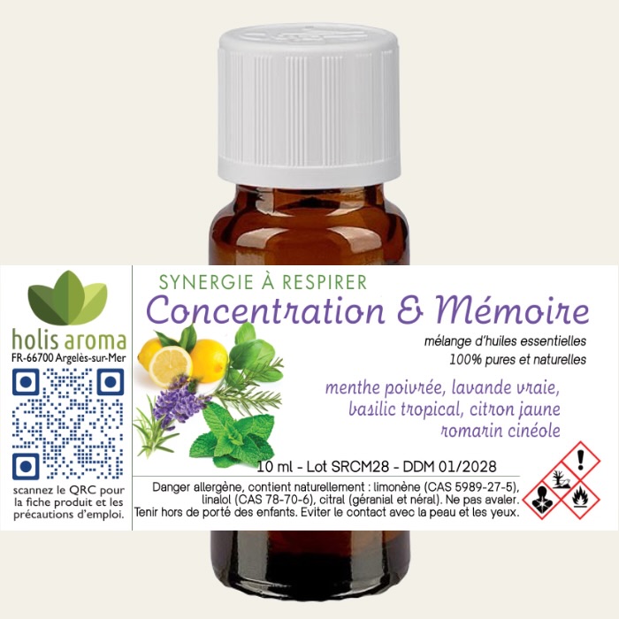 Concentration & Mémoire contient des huiles essentielles 100 % pures et naturelles : Menthe poivrée, Laurier noble, Basilic tropical, Citron jaune, Romarin à cinéole.
