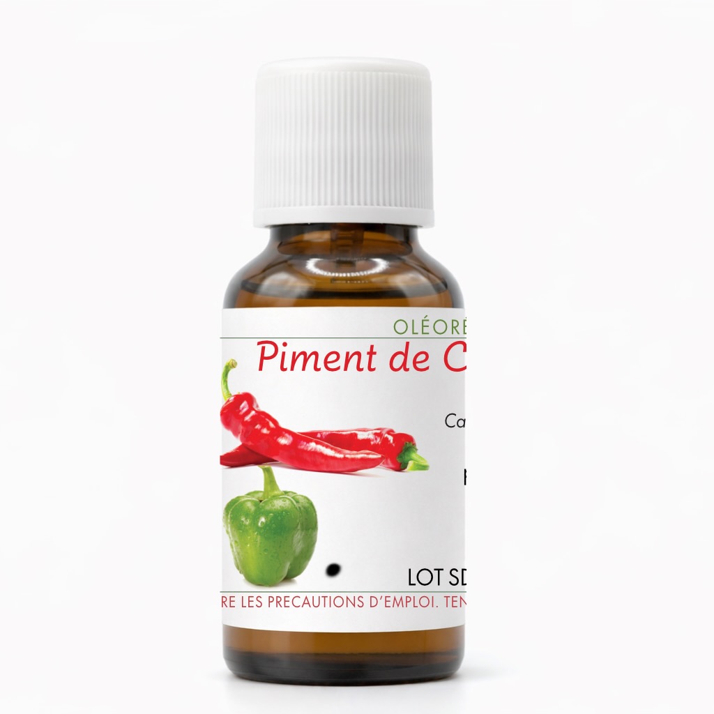 Obtenue par extraction des fruits du piment, cette oléorésine possède une odeur chaude, épicée et caractéristique. Elle est principalement utilisée fortement diluée dans des préparations pour massage corporel, notamment dans les soins visant à soutenir le confort musculaire après l’effort ou en cas de zones de tension.