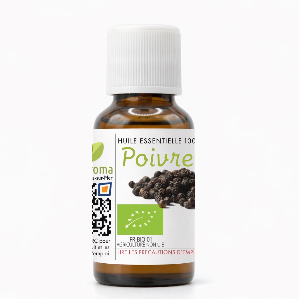 L’huile essentielle de Poivre Noir (Piper nigrum), certifiée Biologique (FR-BIO-01), est reconnue en aromathérapie pour ses usages traditionnels liés aux fatigue passagère, tensions musculaires légères et inconfort digestif occasionnel. Elle est particulièrement appréciée pour ses propriétés réchauffantes et stimulantes.