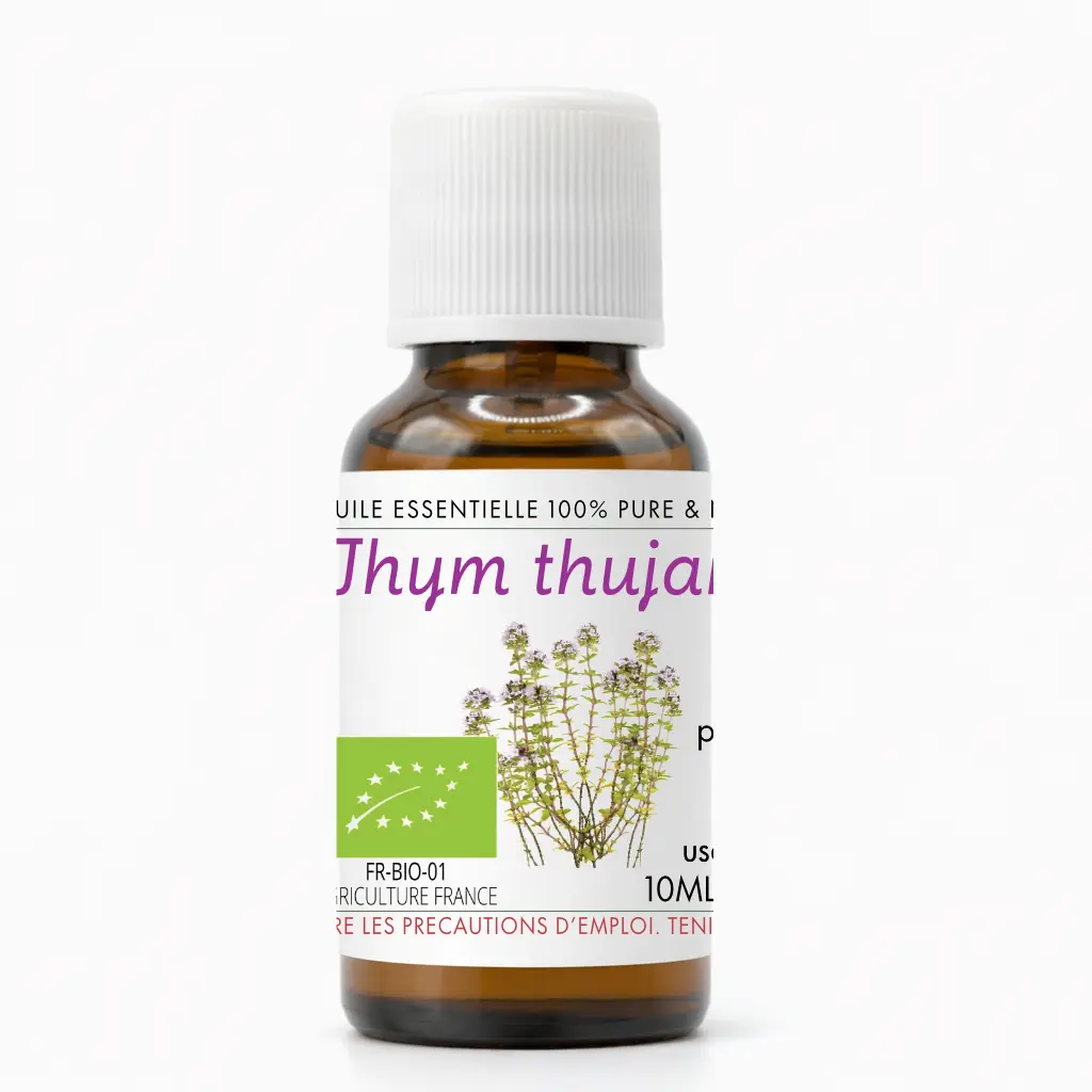 L’huile essentielle de Thym Thujanol (Thymus vulgaris ct. thujanol), certifiée Biologique (FR-BIO-01), est reconnue en aromathérapie pour ses usages traditionnels liés aux inconforts respiratoires légers, fatigue passagère et soutien des défenses naturelles. Elle est particulièrement appréciée pour ses propriétés tonifiantes, stimulantes et équilibrantes.