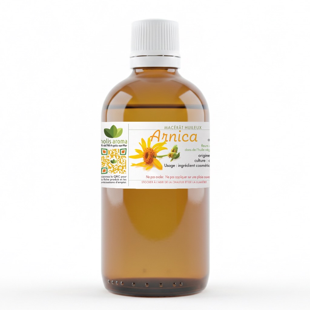 Macérât obtenu par infusion lente à froid des fleurs d’Arnica (Arnica montana) dans une huile végétale, ce macérât huileux 100 % pur et naturel est reconnu pour ses propriétés nourrissantes, apaisantes et revitalisantes. Originaire d’Europe et conditionné dans un flacon en verre ambré avec compte-gouttes, il conserve toutes ses qualités naturelles.