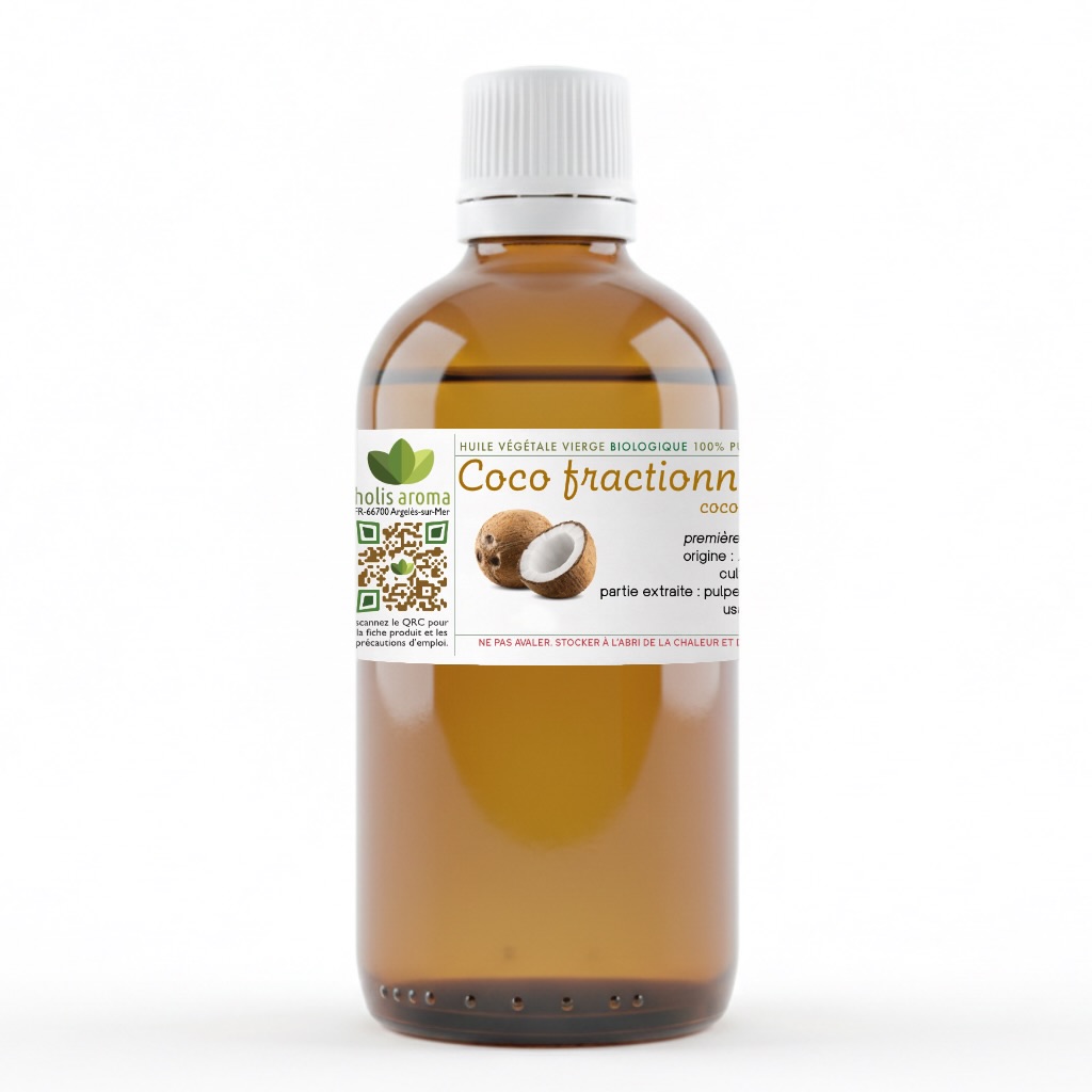 Issue de l’huile de Coco (Cocos nucifera) biologique, cette huile végétale fractionnée est composée principalement de triglycérides à chaîne moyenne. 100 % pure et naturelle, elle se distingue par sa texture légère, fluide et non grasse, très appréciée en cosmétique.