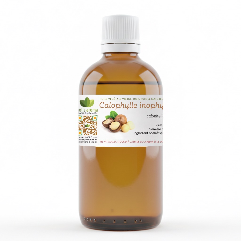 Obtenue par première pression à froid des noix de Calophylle (Calophyllum inophyllum), cette huile végétale 100 % pure et naturelle est appréciée pour ses propriétés nourrissantes, assouplissantes et protectrices. Certifiée biologique et conditionnée dans un flacon en verre ambré avec compte-gouttes, elle préserve l’ensemble de ses qualités naturelles.