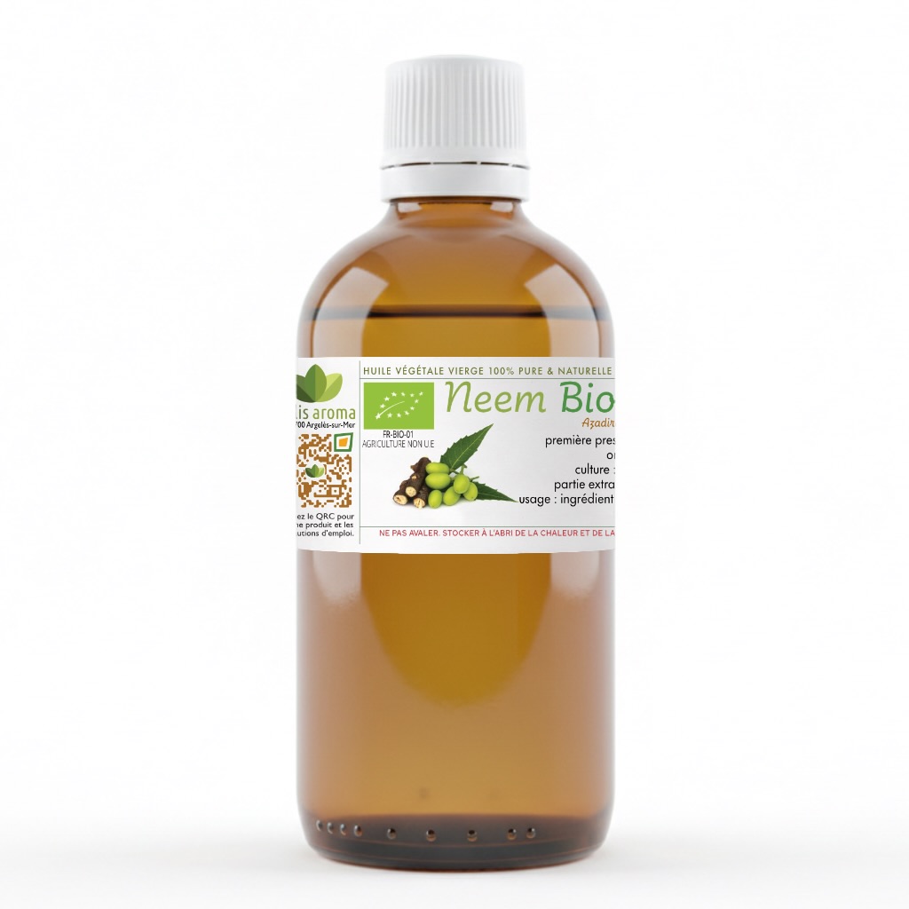 Huile végétale obtenue par première pression à froid des graines de Neem (Azadirachta indica), cette huile 100 % pure et naturelle est reconnue pour ses propriétés nourrissantes, protectrices et revitalisantes. Originaire d’Inde et certifiée biologique (FR-BIO-01), elle est conditionnée dans un flacon en verre ambré avec compte-gouttes afin de préserver toutes ses qualités naturelles.