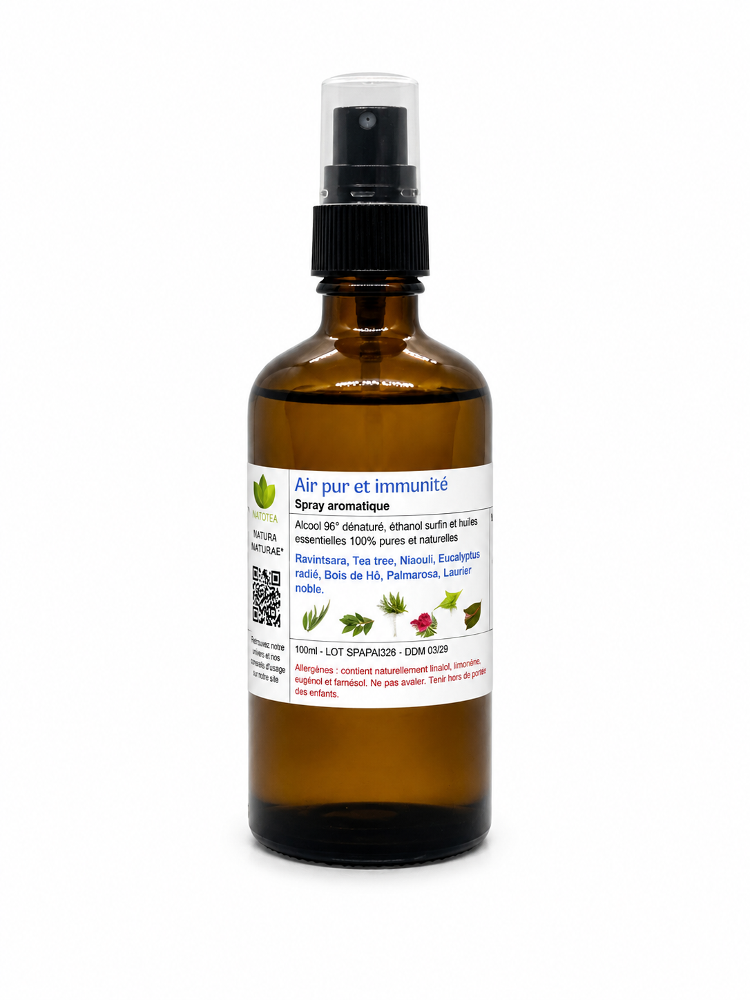 Air Pur & Immunité contient des huiles essentielles 100 % pures et naturelles : Ravintsara, Tea tree, Niaouli, Eucalyptus radié, Bois de Hô, Palmarosa et Laurier noble, diluées dans de l’alcool d’origine végétale (éthanol surfin 96° dénaturé).