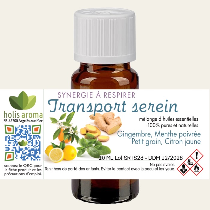 Transport serein contient des huiles essentielles 100 % pures et naturelles : Gingembre, Menthe poivrée, Citron jaune et Mandarine.